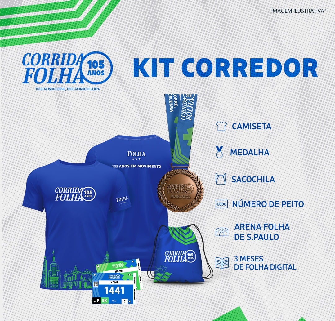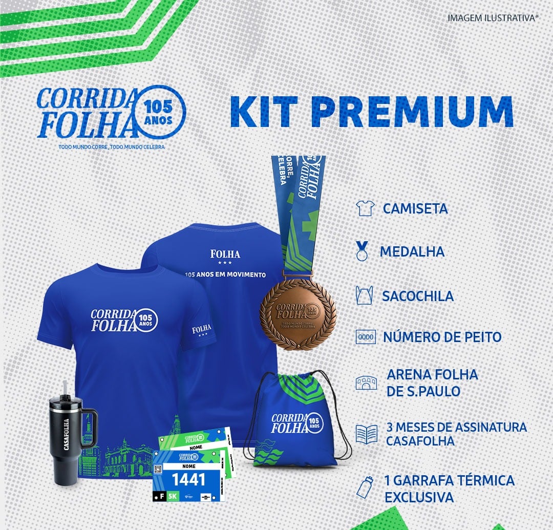 Kit Premium: Camiseta, Sacochila, Medalha, Nº de peito, Arena Folha de S.Paulo + garrafa térmica exclusiva e 3 meses de assinatura CasaFolha.