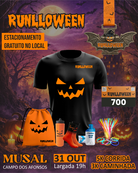 Prepare-se para uma noite de adrenalina e diversão na Runlloween, a corrida temática mais aguardada do ano! 🏃♀️🎉 📅 Data: 31 de Outubro ⏰ Horário: 19:00 📍 Local: Museu Aeroespacial (MUSAL) Em um cenário mágico e misterioso, você terá a oportunidade de participar em duas modalidades: Corrida de 5km 🏅 Caminhada de 3km 🚶♂️